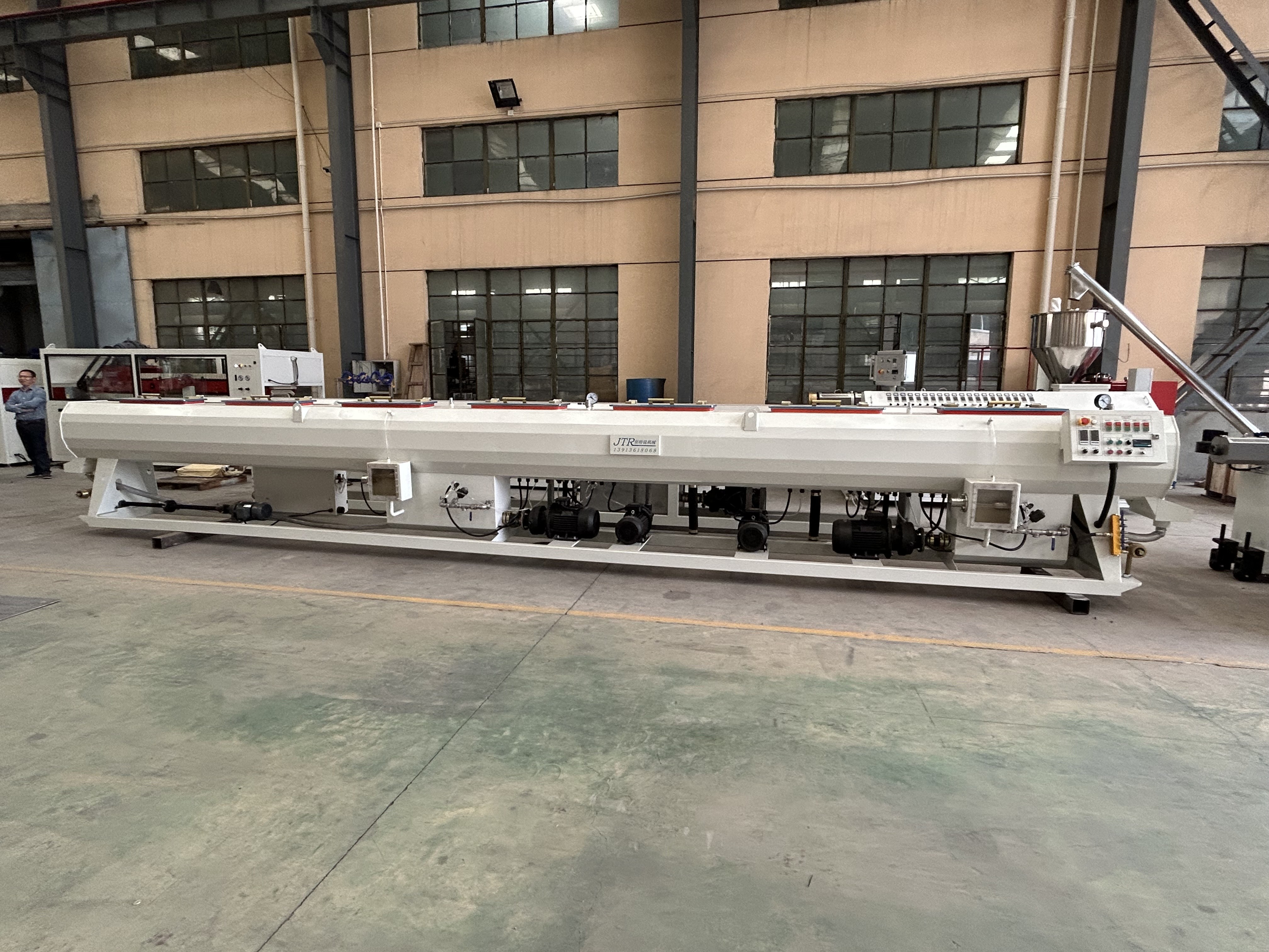Raw material +master batches → mixing → vacuum feeder→ material dryer → single screw extruder ( small CO-extruder ) → mould → vacuum calibration tank → spray cooling tank ( water tank) → haul-off unit → cutting machine→ stacker