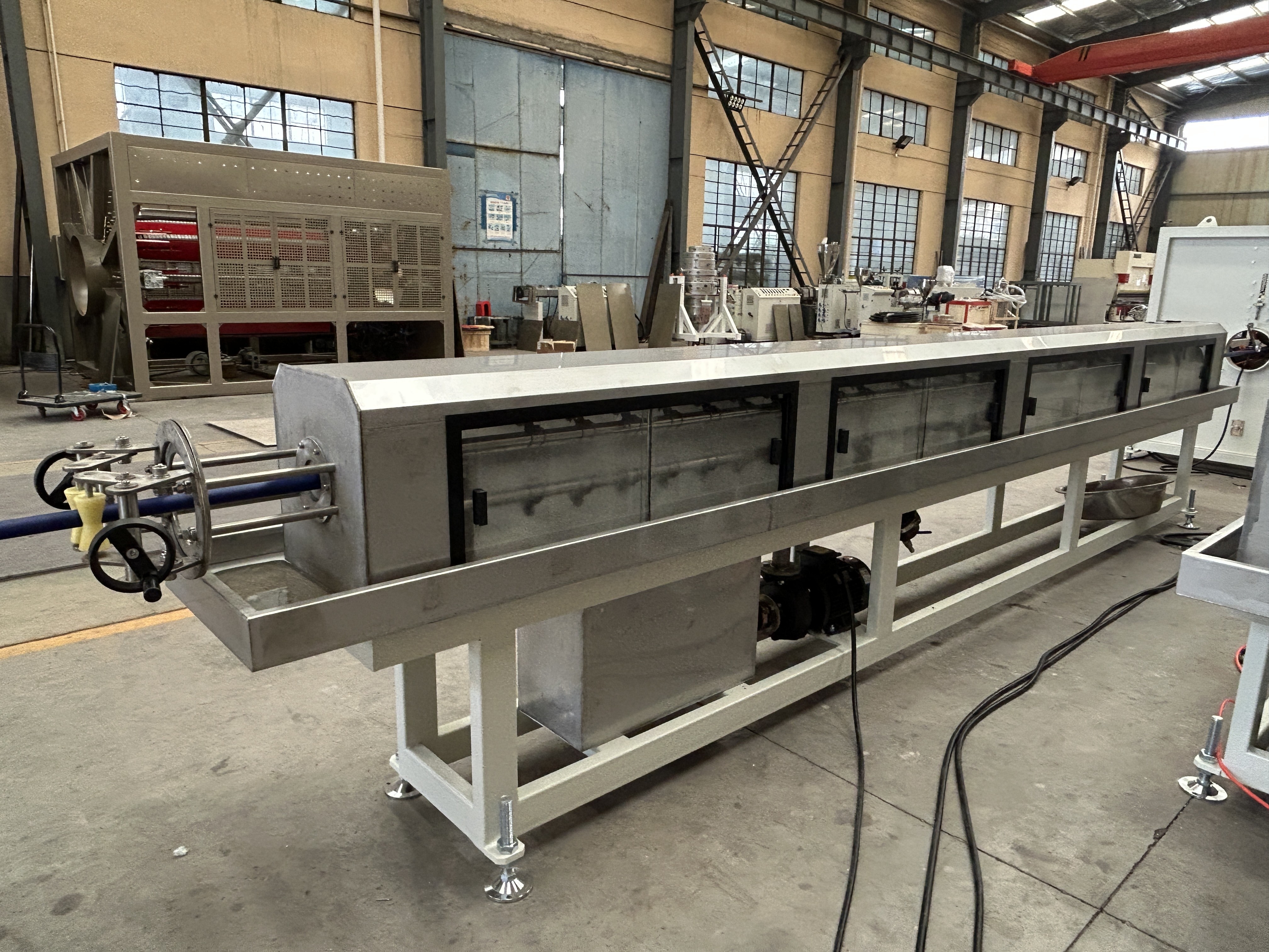 للأنابيب PPR، مع نظام التحكم في درجة حرارة الزيت الداخلية.الذي هو أكثر ملاءمة لإنتاج PPR منخفضة درجة الحرارة للطحن.مع داخل زيت التحكم في درجة الحرارة،جسم الفولاذ المقاوم للصدأ جميلة وعملية لمعايرة الفراغ ونظام تبريد رش،نظام الفراغ متعدد المقاطع الفريد يضمن الحجم المستقر والتبريد للأنابيب؛ نظام التبريد بالرذاذ الخاص يزيد من كفاءة التبريد ؛ وضع المياه الخاص، نظام درجة حرارة المياه يجعل الآلة أكثر ذكاء،تتبنى وحدة التنقل بنية خاصة من الحديد، والتي هي سهلة ومريحة للتشغيل ؛ شفرة الحجر يستخدم نظام الجمع الميكانيكي والهوائي ، والتي هي أكثر موثوقية. نظام القطع يتبنى شفرات المنشار ووسائل القطع الكوكبية؛يأتي باستخدام نظام هيدروليكي، والذي يضمن قطعًا عرضيًا سلسًا ؛ مجهزة بوحدة جمع الغبار ، والتي تضمن بيئة عمل نظيفة. الوحدة ذات أداء موثوق بها وكفاءة إنتاج عالية.