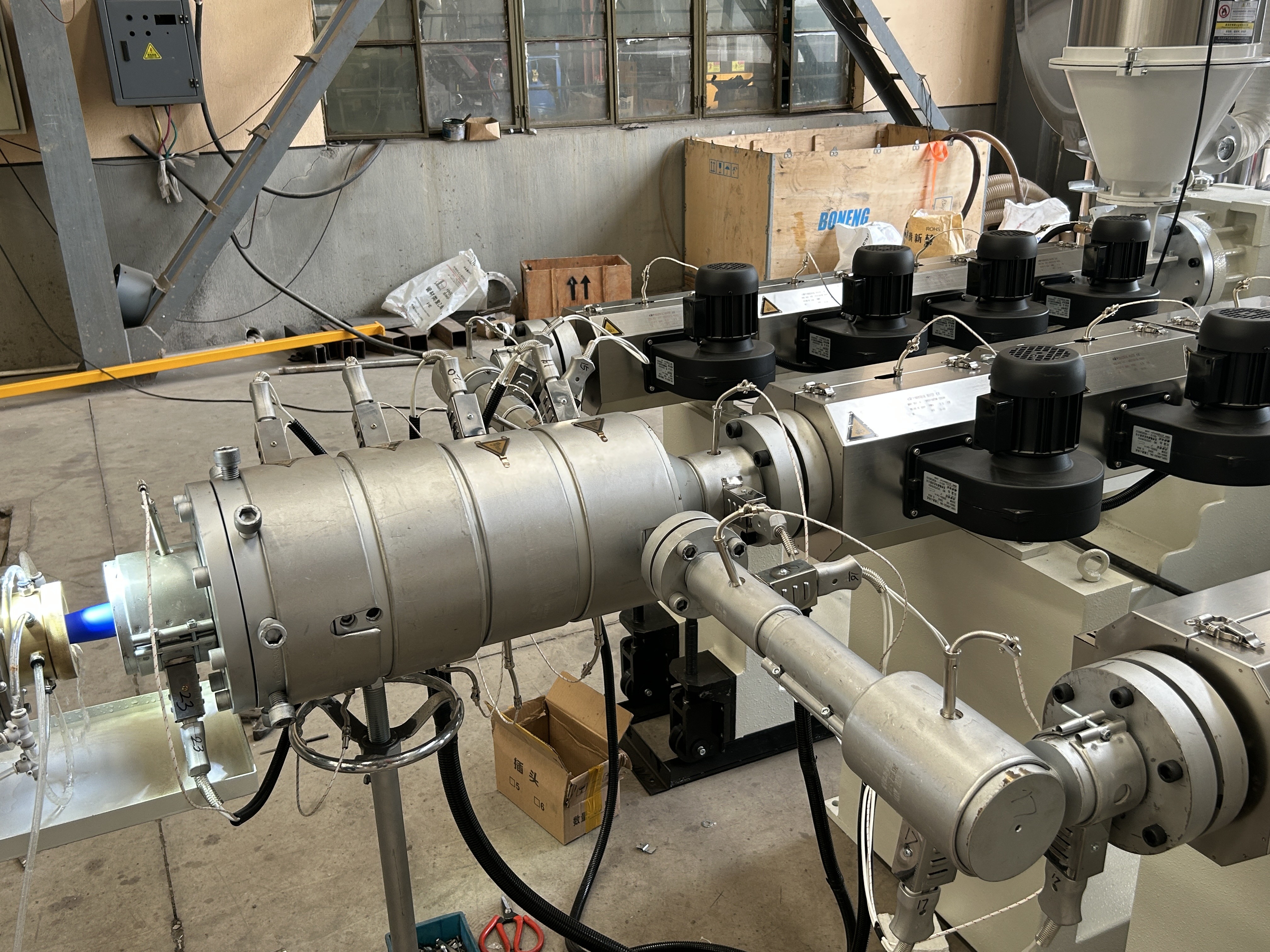 يمر البلاستيك المنصهر من خلال رأس الطلاء لتشكيل أنابيب / ملفات تعريف ، ثم يدخل خزان معايرة فراغ للحصول على حجم دقيق وتبريد.