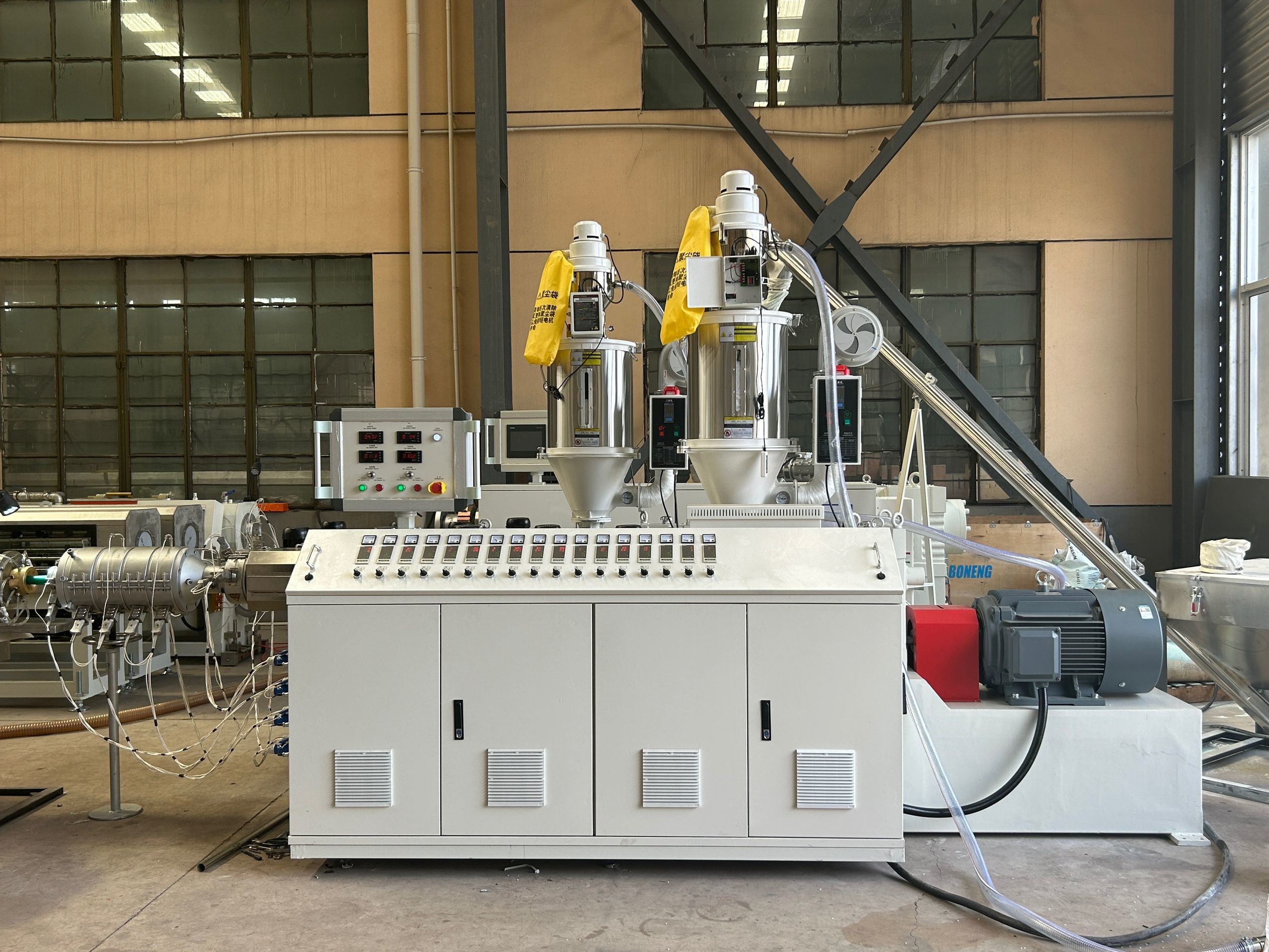 يتم إدخال المواد الخام (حشرات PPR / PVC ، المواد الإضافية) تلقائيًا إلى الحافلة ويتم خلطها بشكل موحد.