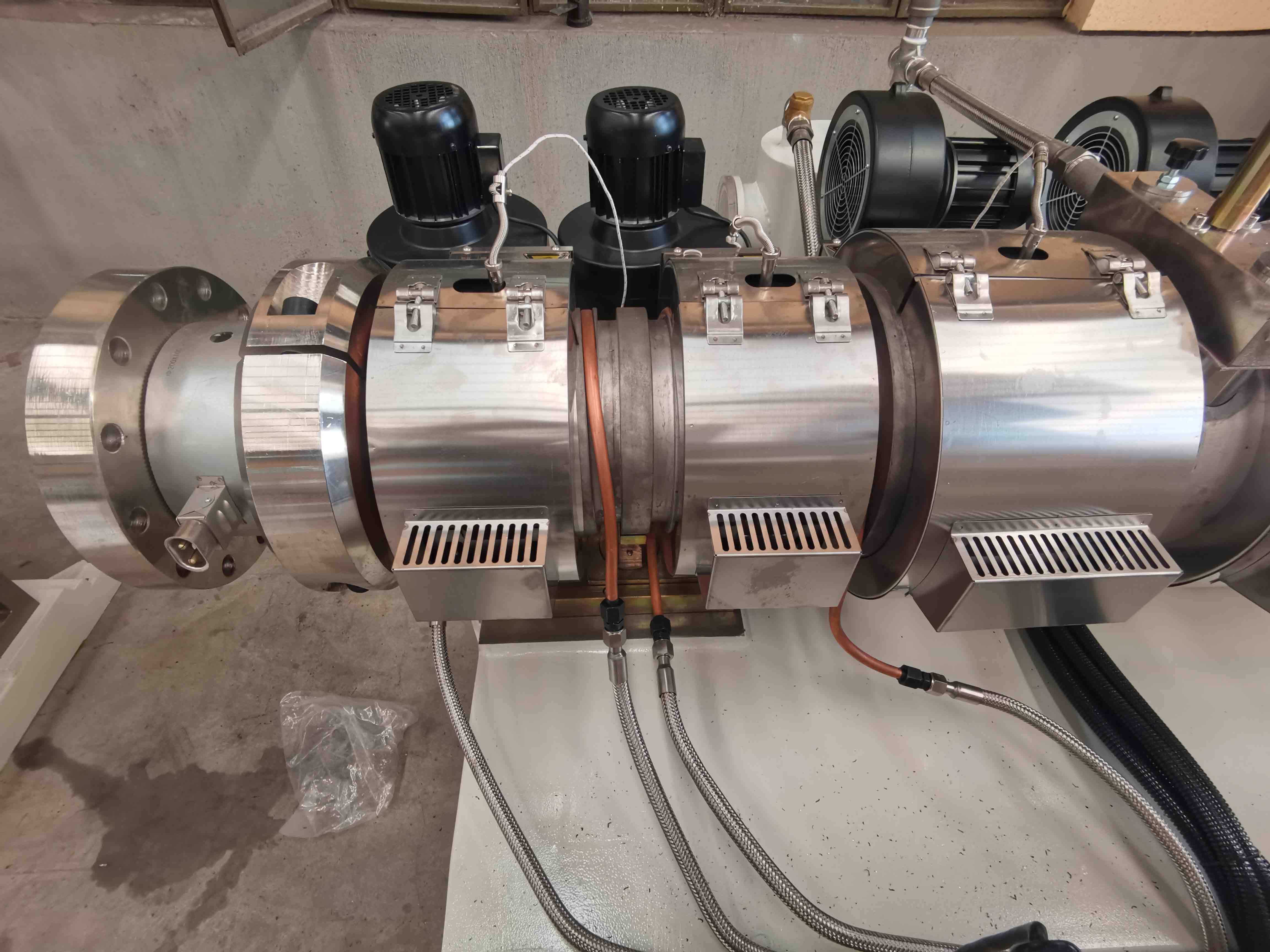 - بالنسبة للخراطيم المموجة، يمر PVC المنصهر عبر خزان التحجيم بالفراغ وقوالب التمويج.