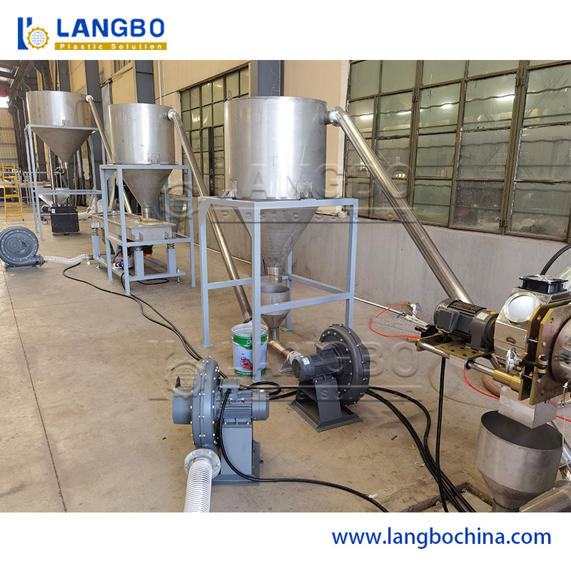 Raw material+ additive → Mixing → Conveying feeding → hopper feeding → Conical twin screw extruder → Hot face cutting → Cyclone separator → Vibration sieve → Blowing system → Storage hopper → Finished product packing
